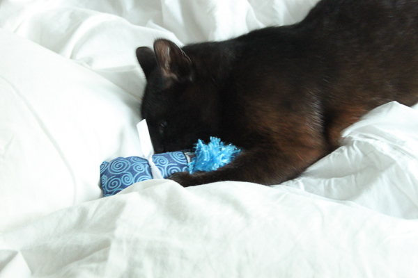 Vaikka joutui tänään veitsen alle niin Smirre on ollut tosi reippaana koko päivän. Ihan samaan tapaan on ollut ruokakuppia kolistelemassa ja rapsuteltavana. Annoin tässä hetkisitten Smirrelle uuden lelun ja voi pojat että onkin mieluinen. Tuossa on jo yli puoli tuntia antanut lelulle kyytiä :) Mutta eiköhän me pian panna nukkumaan, Smirre onkin tosi kiltti öisin. Ei mitään meteliä pidä vaan vieressä nukkuu tyytyväisenä.
